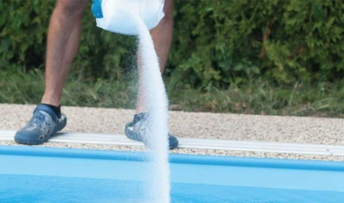 Bước 2: Thực hiện pha bột sô da với nước 1 – 3kg/100m3/lần rồi thực hiện rãi đều quanh hồ bơi